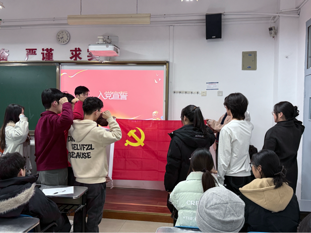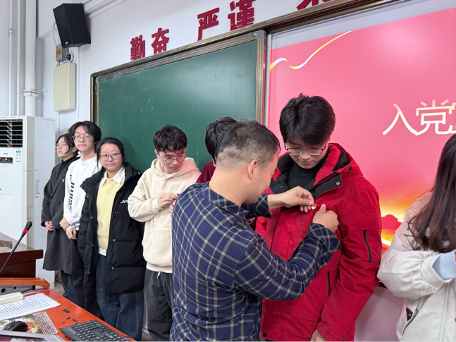 支部成员围绕发展对象的表现展开充分讨论,经无记名民主表决,一致同意接收相关发展对象为预备党员。随后,支部书记张虎老师为新接收的预备党员郑重佩戴党徽,党徽不仅是身份的象征,更承载着沉甸甸的责任与使命,凝聚着支部的信任与期许。佩戴党徽后,全体预备党员面向党旗庄严宣誓,铮铮誓言铿锵有力、掷地有声,既是对党的忠诚承诺,也展现出新时代青年学子红心向党的坚定信念与勇于担当的精神风貌,现场氛围庄重而热烈。