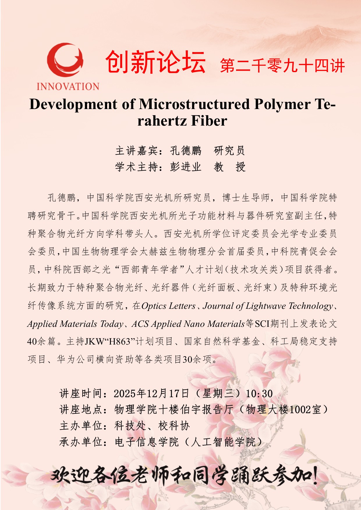 西北大学创新论坛第二千零九十四讲:Development of Microstructured Polymer Terahertz Fiber